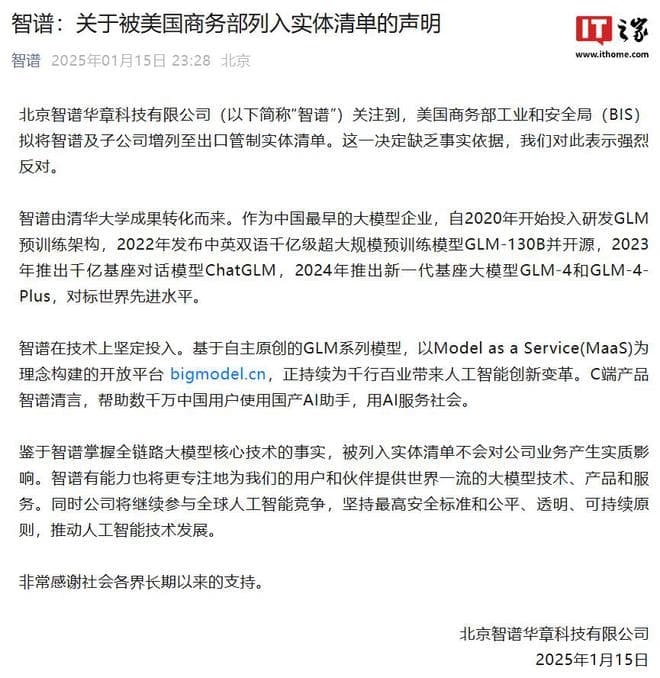 IT之家 1 月 16 日消息,北京智谱华章科技有限公司昨日晚发布关于被美国商务部列入实体清单的声明,IT之家附声明原文内容如下: