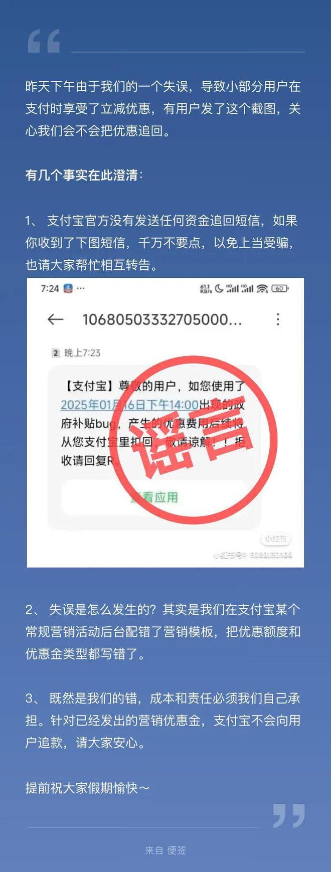 1月17日凌晨,@支付宝 发文回应重大bug事故↓