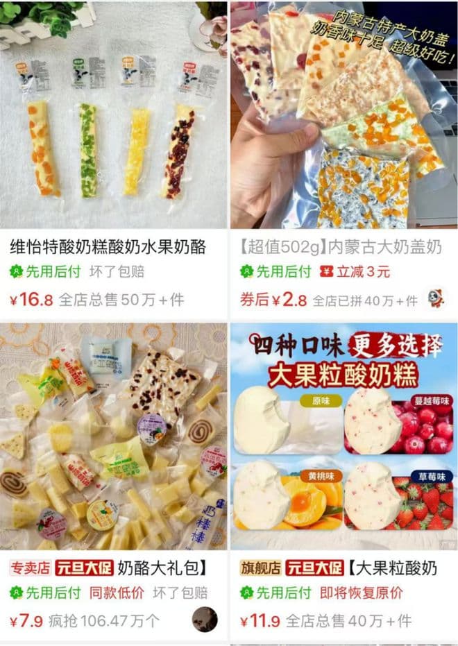 尽管酸奶糕在哈尔滨爆火,但内蒙古的拼多多商家付佳并没有简单复制网红产品,而是关注到了热度之下消费者的真实评价,提到酸奶糕“块头大”“粘牙”“齁甜”导致复购低的问题,于是她创新性地推出50g小包装,并以真实奶源为主要原料,还制作出了黄桃、蓝莓、草莓的多种口味。