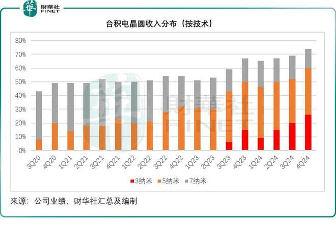 管理层预计其2025年资本开支预算将介于380亿-420亿美元之间,较其2024年全年资本开支298亿美元高出28%-41%。2025年的资本开支中,大约有七成将用于先进制程,约10%-20%用于特定技术,约10%-20%将用于先进封装、测试、掩模和其他。