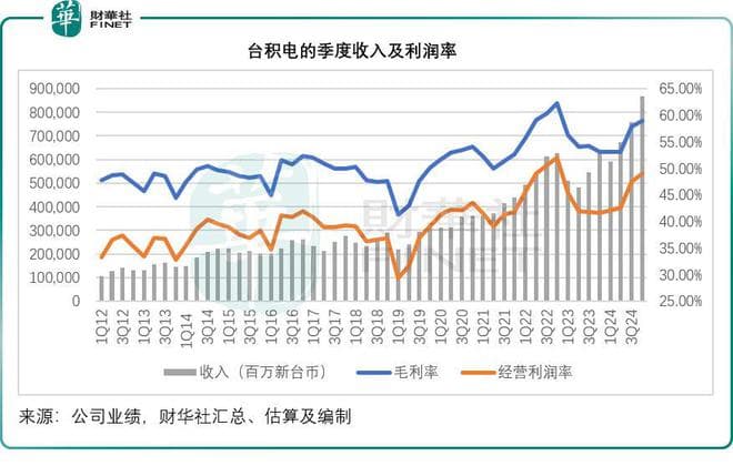 2024年全年,得益于3纳米和5纳米制程产品需求强劲,台积电的2024年收入达到2.89万亿新台币,按年增长33.89%;毛利率按年上升1.76个百分点,至56.12%,主要反映整体产能使用率的改善,抵消了3纳米制程摊释利润和电力成本增加的负面影响。全年经营利润率按年上升3.05个百分点,至45.68%。股东应占净利润按年增长39.92%,至1.17万亿新台币。