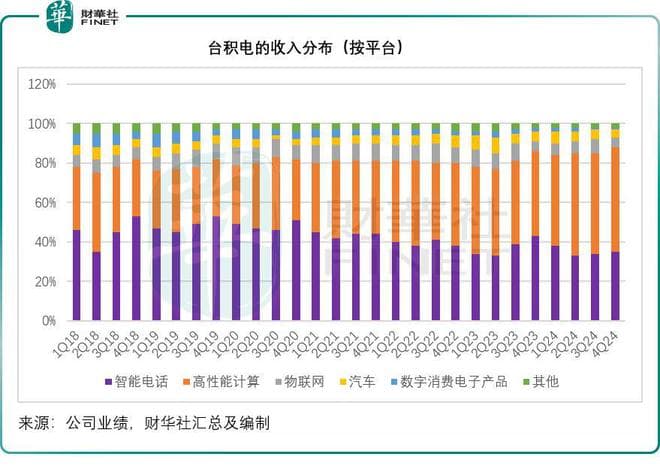 财华社留意到,就平台而言,高性能计算(HPC)增长非常强劲,这部分业务主要为高端算力芯片,例如英伟达(NVDA.US)的AI芯片订单。台积电的数据显示,第4季HPC的收入按季增幅高达19%,为各类别的最高,智能电话的增幅也保持在17%的水平,汽车则增长6%,抵消了物联网下降15%和消费电子(DCE)下降6%的影响。