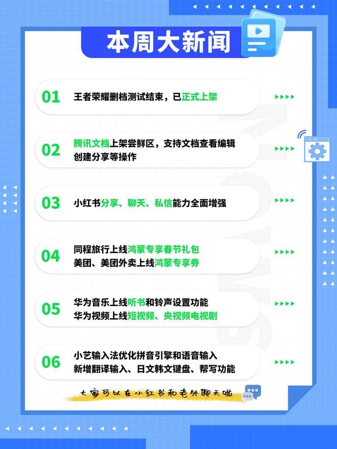 除了上述应用外,小红书对分享、聊天以及私信能力进行了全面增强;正逢春节,同程旅行特别上线鸿蒙专享春节礼包;美团及美团外卖也纷纷上线鸿蒙专享券;华为自由应用华为音乐上线了听书和铃声设置功能;华为视频则上线了短视频以及央视频电视剧;此外,小艺输入法优化了拼音引擎和语音输入功能,还新增了翻译输入、日文韩文键盘以及帮写功能。
