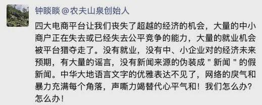 【钟睒睒连发3条朋友圈炮轰电商平台:经济的“绞肉机”,中小经营户的“周扒皮”】农夫山泉创始人钟睒睒连发3条朋友圈,炮轰四大电商平台。钟睒睒指出,四大电商平台是经济的“绞肉机”,是中小经营户的“周扒皮”。他还表示,这些平台让大众丧失了超越经济的机会,大量的中小商户正在失去或已经失去公平竞争的能力,大量就业机会被平台猎夺走了。他直言,“网络的戾气和暴力充满每个角落,声嘶力竭替代心平气和!我们怎么办?怎么办!”值得注意的是,虽然他未提及四大平台名称,但他转发的两条视频均与送餐平台有关,其中一博主以“平台是骑手的母亲”为题暗讽,另一博主讲述了送餐平台抽成问题,称“在某单外卖中,商家赚10.5元,骑手赚20.1元,中间的36元全被平台抽走”。(新浪科技)