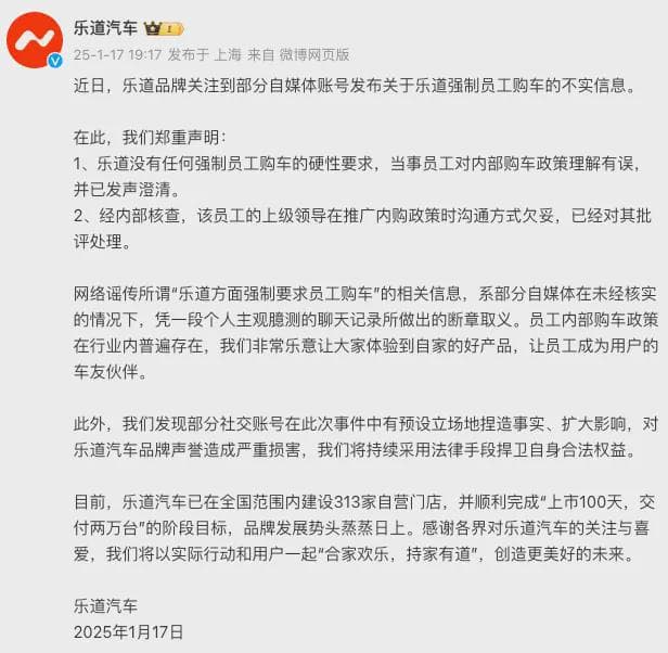 【乐道汽车:没有任何强制员工购车的硬性要求】1月17日晚间,蔚来旗下乐道汽车发布声明称,乐道没有任何强制员工购车的硬性要求,当事员工对内部购车政策理解有误,并已发声澄清。经内部核查,该员工的上级领导在推广内购政策时沟通方式欠妥,已经对其批评处理。(界面新闻)
