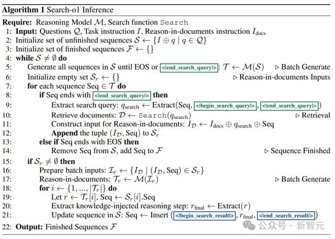 如上述算法流程图所示:对于每个问题,Search-o1推理首先通过将任务指令I与特定问题q连接来初始化推理序列。随着推理模型ℳ生成推理链ℛ,它可能会产生封装在特殊符号<|begin_search_query|>和<|end_search_query|>之间的搜索查询。