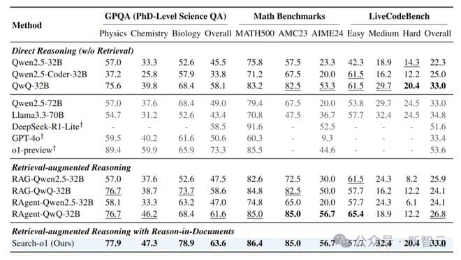 这凸显了Search-o1在利用文档检索和推理实现跨领域性能方面的有效性,其表现可与专家级能力相媲美甚至超越。