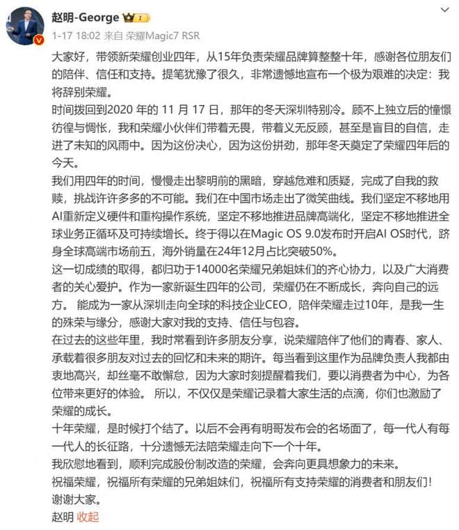 他提到了曾经的奋斗历程,提到了荣耀如何用AI重新定义硬件和重构操作系统,坚定推进品牌高端化。他的文字中满是不舍、遗憾,但仍祝福荣耀奔向更好的未来。在公司内网他表示,自己将调整与修复不堪重负的身体,陪伴家人,读读书,完善自己。