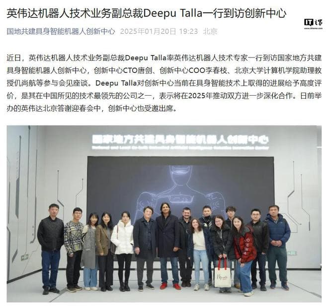 IT之家 1 月 22 日消息,据北京国家地方共建具身智能机器人创新中心官方微信号 1 月 20 日消息,英伟达机器人技术业务副总裁 Deepu Talla 一行到访。Deepu Talla 表示,将在 2025 年推动双方进一步深化合作。