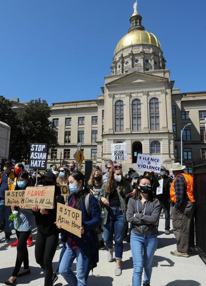 2021年3月20日,人们手持标语在美国佐治亚州亚特兰大市的佐治亚州议会大厦前举行集会,抗议针对亚裔的暴力、种族歧视和仇外情绪。新华社