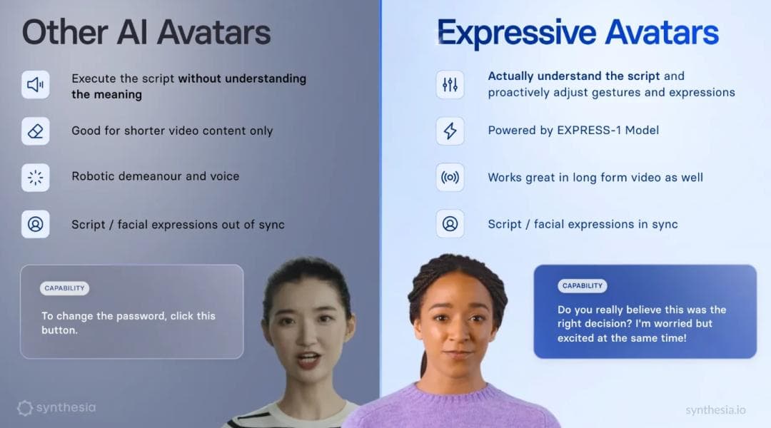 如今,该公司已经推出了第四代AI虚拟形象Expressive Avatars,这也是世界上首个完全由AI生成的虚拟形象。这些虚拟形象由EXPRESS-1模型提供支持,能够实现逼真的表演。