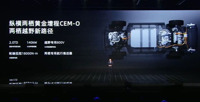 和前面两款车不同,纵横G900搭载的动力系统是纵横两栖黄金增程CEM-O。