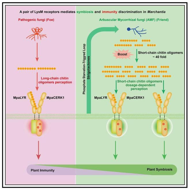 论文第一作者、分子植物卓越中心博士生谭新行介绍,共生微生物的“身份证”是短链几丁质壳聚糖CO4/5,而病原微生物的则是长链几丁质壳聚糖CO7/8。当MpaLYR拿到“身份证”后,就会与MpaCERK1结合成一把“钥匙”,收到CO4/5的“身份证”就激发细胞的共生反应,收到CO7/8的“身份证”就立刻启动免疫反应,让细胞启动免疫反应来赶走“敌人”。
