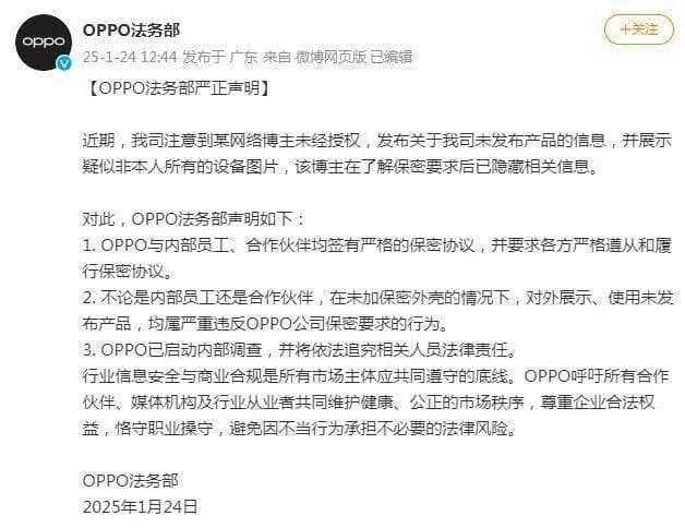1月24日,OPPO法务部发文称,近期,我司注意到某网络博主未经授权,发布关于我司未发布产品的信息,并展示疑似非本人所有的设备图片,该博主在了解保密要求后已隐藏相关信息。