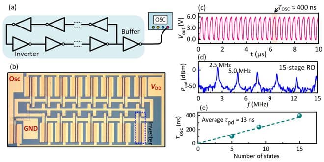此外,为确保芯片工艺具备较高的一致性,研究人员设计了一种自停止工艺来控制器件制备过程的刻蚀过程,最终实现了 15 级的环振电路。