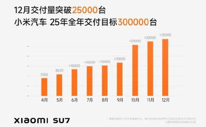 2025年1月1日,小米汽车在微博发布消息称,2024年12月交付量突破25000台。