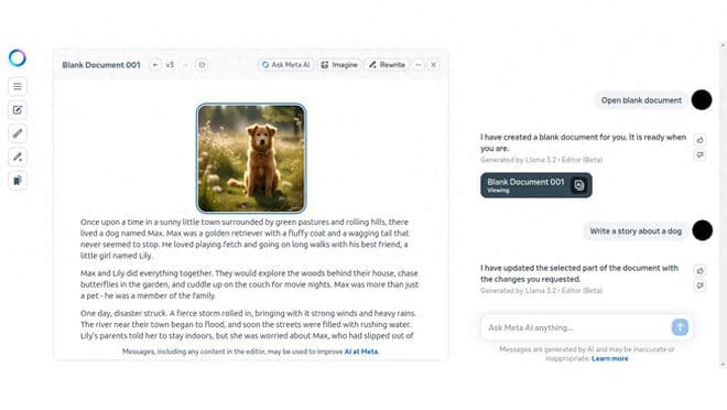 如果您所在的国家可以访问 Meta AI,那么您现在就可以访问 Web 客户端,开始编写人工智能辅助文档。 当你打开一个空白文档时,你会得到一个供书写的画布、一些选项(如粗体、斜体、重写和想象),以及一个侧边栏,在这里你可以与 Meta 的 Llama 3.2 聊天,对文档进行修改。