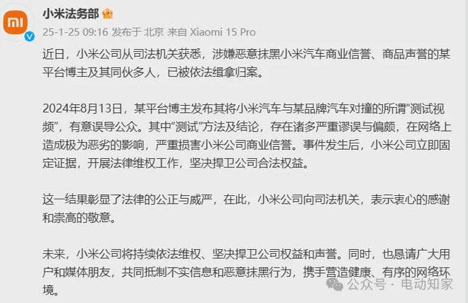 2025年1月25日,小米法务部发布消息称,近日,小米公司从司法机关获悉,涉嫌恶意抹黑小米汽车商业信誉、商品声誉的某平台博主及其同伙多人,已被依法缉拿归案。2024年8月13日,某平台博主发布其将小米汽车与某品牌汽车对撞的所谓“测试视频”,有意误导公众。其中“测试”方法及结论,存在诸多严重谬误与偏颇,在网络上造成极为恶劣的影响,严重损害小米公司商业信誉。事件发生后,小米公司立即固定证据,开展法律维权工作,坚决捍卫公司合法权益。