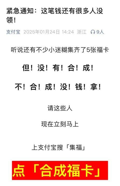 近日,支付宝官方提醒,2025年集福开奖不用等除夕,大家选择任意主题福卡后,集齐五张福卡点击「合成」就可立即开奖。