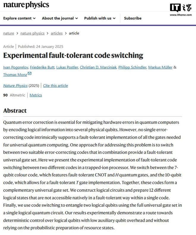 IT之家 1 月 26 日消息,奥地利因斯布鲁克大学宣布,该校联合德国亚琛工业大学的研究团队,在量子计算容错技术领域取得突破性进展。