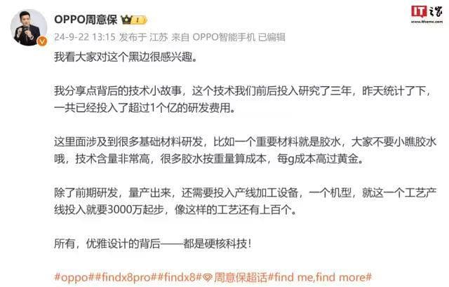 其实在去年 Find X8 / Pro 发布前,OPPO Find 系列产品负责人周意保就曾分享称手机黑边技术前后投入研究了三年,一共已经投入了超过 1 个亿的研发费用,并剧透 Find X8 Ultra 的窄边框“更加惊艳”。