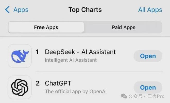 今日,DeepSeek更是登顶苹果中国地区和美国地区应用商店免费App下载排行榜,并在美区下载榜上超越了ChatGPT。