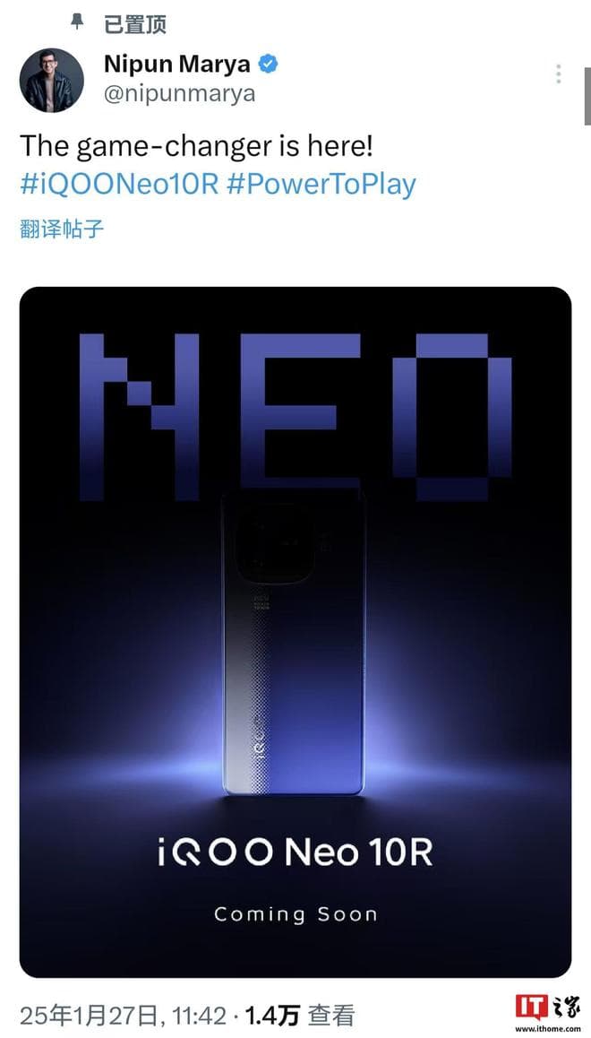 IT之家 1 月 28 日消息,iQOO India 首席执行官 Nipun Marya 昨日发文确认,iQOO Neo 10R 手机即将发布(未透露具体时间,宣传海报仅显示Coming Soon)。