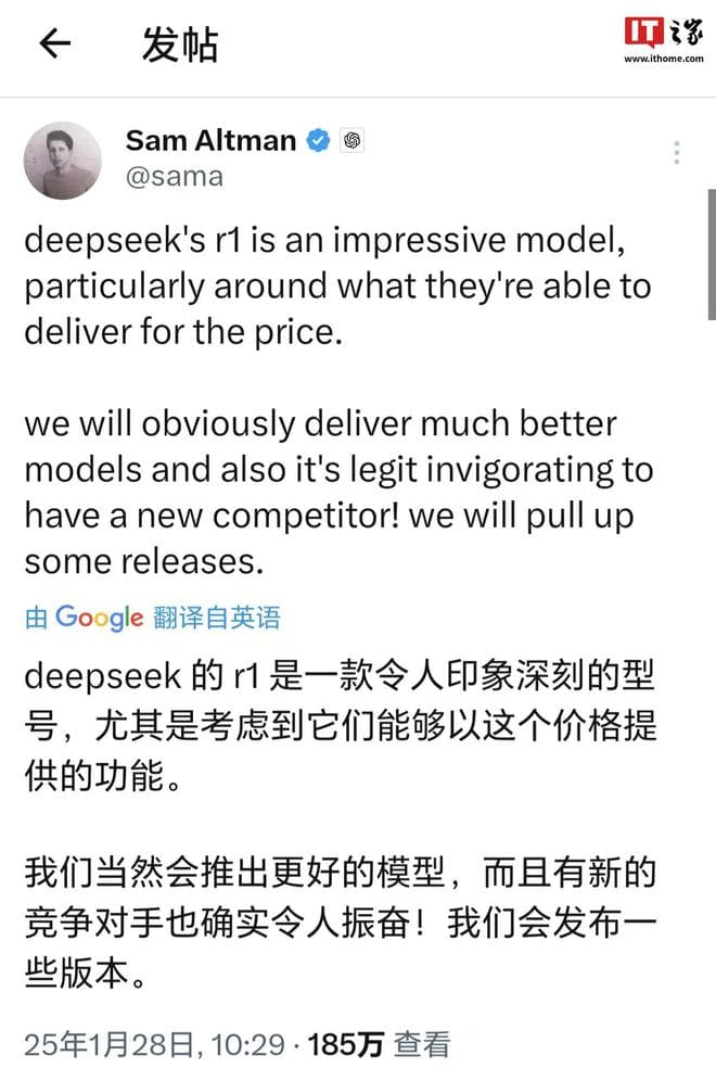 IT之家 1 月 28 日消息,OpenAI CEO 阿尔特曼今日在 X 上发文称,DeepSeek-R1 令人印象深刻,尤其是考虑到其价格和功能性后。另外,他还表示新的对手令人振奋,同时将推出更好的模型。