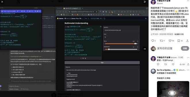 可以看到,在高精度读图上,Janus Pro 也做的很好。能够识别数学表达式和文字的混合排版。未来搭配推理模型使用,可能有更大意义。