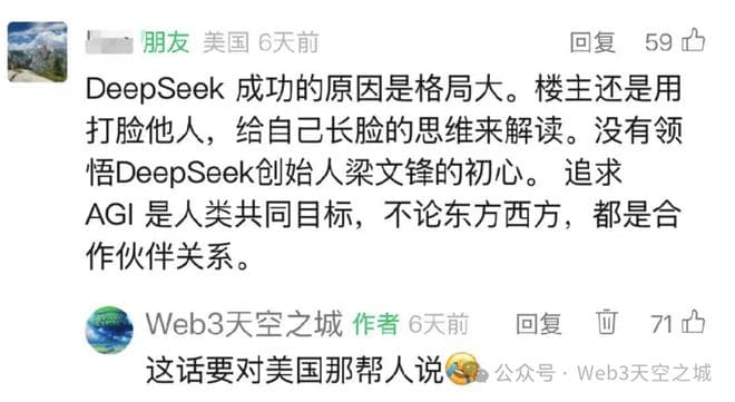 在上一篇文章里,有一位美国的老粉丝留言,指出城主文章的出发点还是打脸, 而DeepSeek创始人成功是因为有着世界大同的高度, 然后做了个回复,两个留言都有很多的赞同: