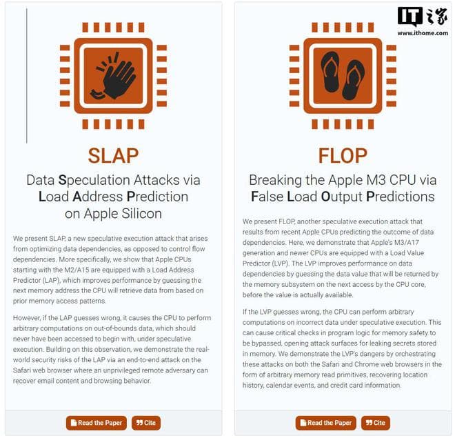 研究人员将这两项新的安全漏洞分别命名为 SLAP 和 FLOP,涉及苹果了 M2、M3、A15 和 A17 芯片。