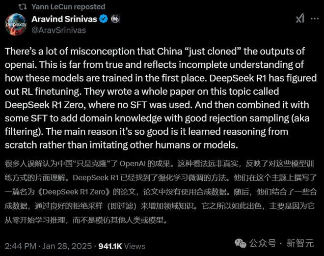 Aravind Srinivas写道,很多人以为中国克隆了OpenAI的成果,他们明显对模型训练方式的理解很片面。