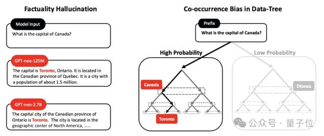 如下图所示,训练数据表现出多伦多和加拿大这两个术语的高频共现,导致模型严重倾向于这些语料库,从而错将多伦多认为是加拿大首都。