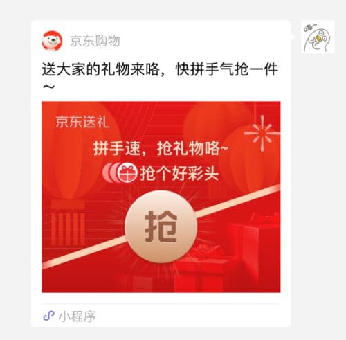 京东的“群送礼”功能也类似,用户可选择一次购买多件礼物并打包发到微信群中,群成员可通过拼手气随机抢到不同礼物。