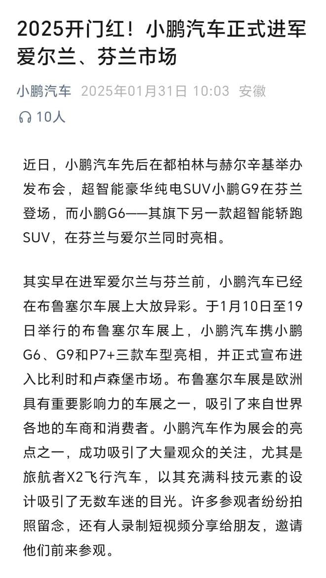 1月31日,小鹏汽车正式官宣,进军爱尔兰、芬兰市场。目前小鹏汽车已进军十余个欧洲国家,计划未来10年海外市场销量占比达50%。