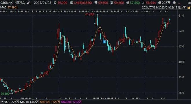 截至2025年1月28日,小鹏汽车港股收盘价约为59港元/股,总市值约为1121亿港元(折合人民币1032亿元)。与2024年8月13日盘中25.5港元/股的阶段性低点相比,不到半年内,小鹏汽车股价已经累计反弹131.37%。