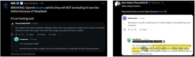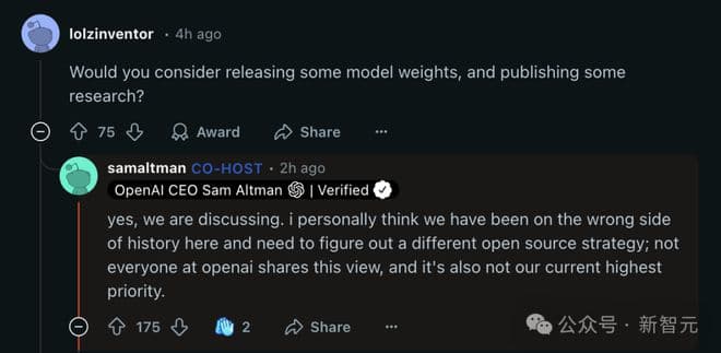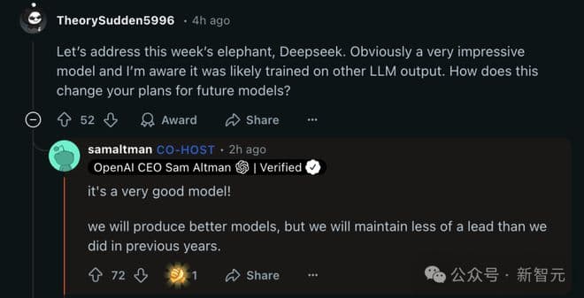 在AMA问答中,奥特曼本人也深深忏悔自己在开源AI上站错了队,不得不承认DeepSeek的强大优势。