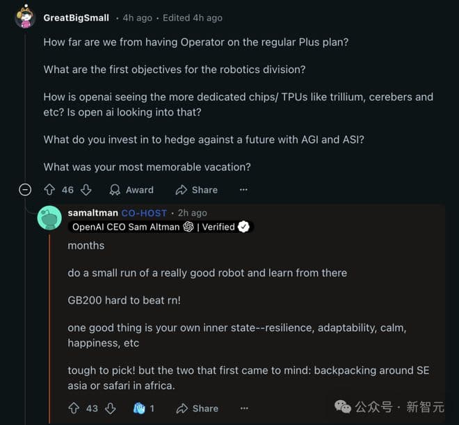 我们距离在常规Plus计划中提供Operator还有多远?机器人部门的首要目标是什么?OpenAI如何看待更专业的芯片/TPU,比如Trillium、Cerebras等?OpenAI是否在关注这方面?投资什么来对冲AGI和ASI未来的风险?你最难忘的假期是什么?