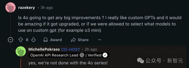 Q:4o是否会有重大改进?我真的很喜欢自定义GPT,如果它能够升级就太棒了,或者如果我们能够在自定义GPT中选择使用什么模型(比如o3 mini)就更好了。