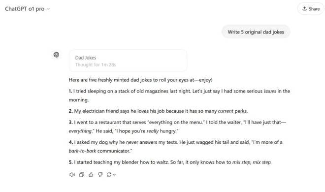 注:老爸笑话(Dad jokes) 是一种特定类型的笑话,通常以简单、直接,甚至有点幼稚或尴尬的双关语或文字游戏为特点。这类笑话通常被认为是「爸爸级」的幽默,因为它们常常是父亲们喜欢讲的那种轻松、无害,还有点「冷」的笑话。