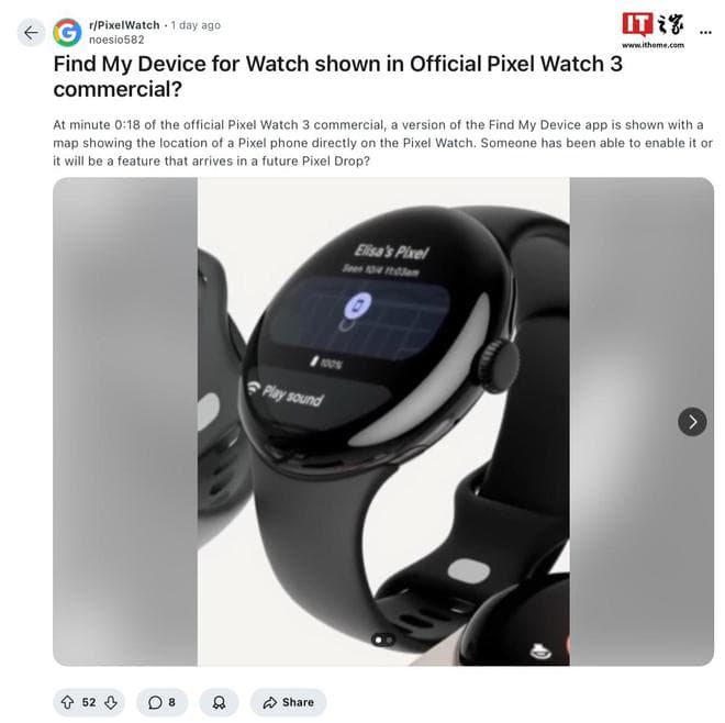 IT之家 2 月 1 日消息,有Reddit用户在谷歌最近发布的Pixel Watch 3宣传视频中发现了一款 WearOS 原生“查找设备”应用,其中显示有设备地图、设备上一次处于在线状态的日期和时间、在设备上播放声音的按钮以及设备剩余电量。
