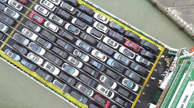 一排排新能源小汽车整整齐齐地停放在专用运输船上。新华社发(黎多江摄)