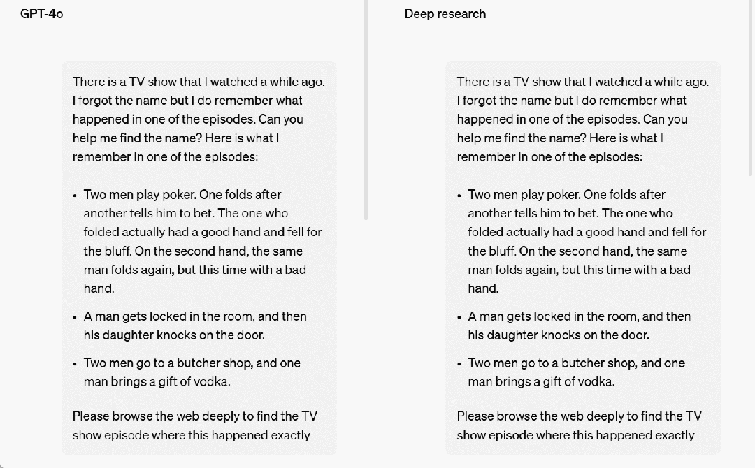 在上述例子中,deep research 被赋予了一个模糊的查询,即使对人类来说也很难找到答案,因为没有关键词能够轻易揭示查询的答案。deep research 能够以创造性和持久性的方式进行搜索,直到找到一个完全符合条件的结果。