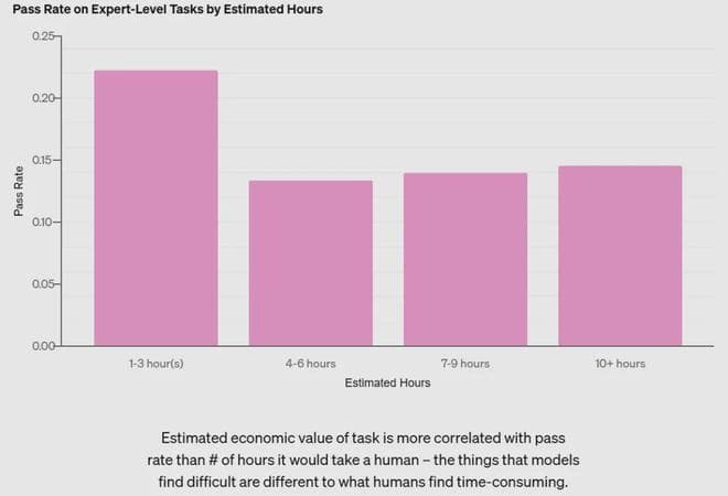 以下两图分别为专家级任务的通过率(按估计经济价值计算)以及专家级任务的预计小时数通过率。