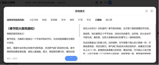 不难发现,在【写】 方面,针对给出的「写一段关于春节防火的居民通知」需求,纳米 AI 搜索能直接给用户生成答案。