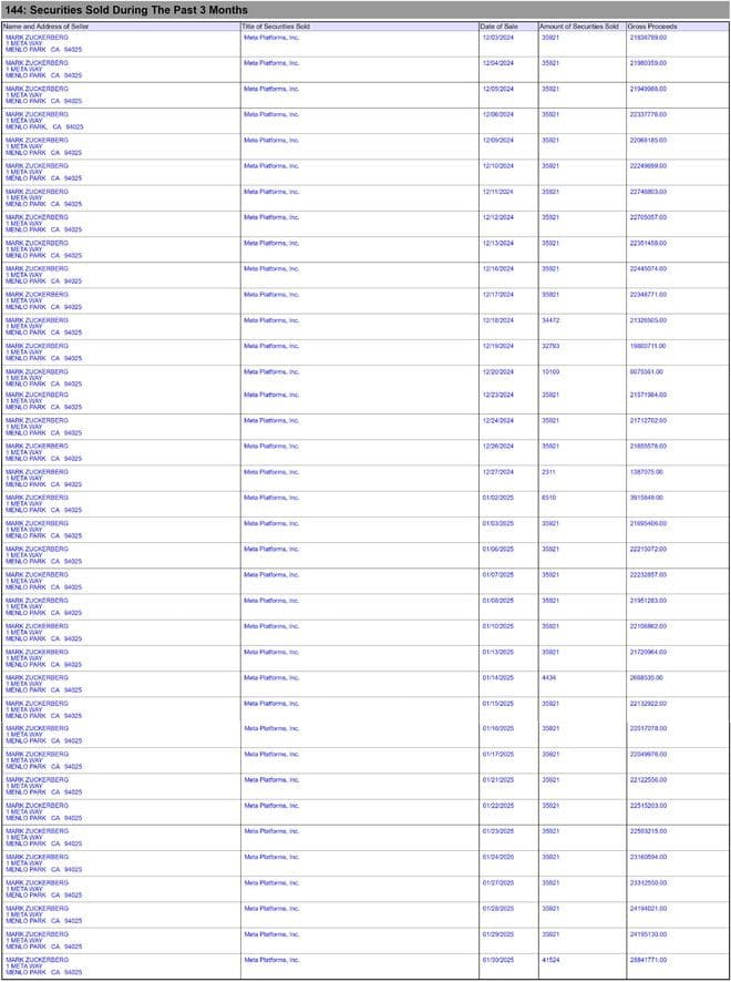 自2024年12月3日以来,扎克伯格就在持续出售公司股权,其中,2024年12月3日、4日、5日、6日、9日、10日、11日、12日、13日、16日、17日、18日、19日、20日、23日、24日、26日、27日,及2025年1月2日、3日、6日、7日、8日、10日、13日、14日、15日、16日、17日、21日、22日、23日、24日、27日、28日、29日、30日也分别进行了套现。