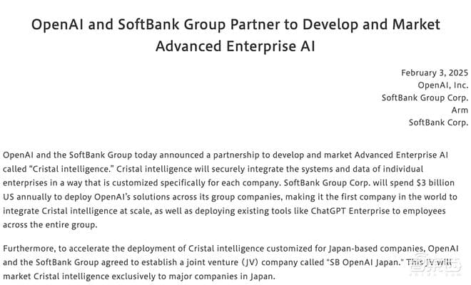 SB OpenAI Japan里的“SB”,是指孙正义的软银,两家公司正在合作蜜月期,合资企业将专注于独家推销一种新型高级企业AI——Cristal intelligence(水晶智能)。
