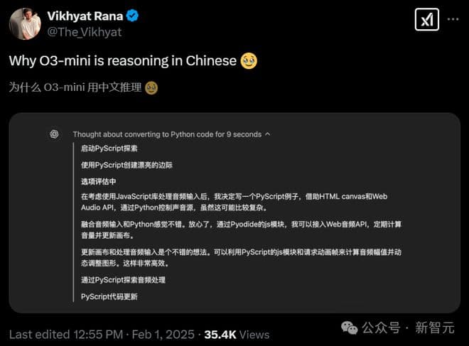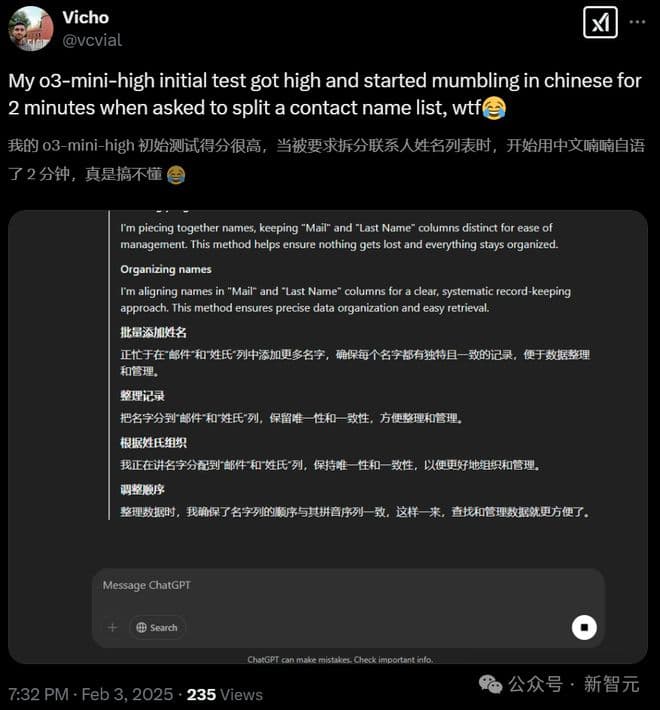 【新智元导读】这两天,国外网友纷纷发现o3-mini-high在思考过程中居然会经常出现中文!难道真如网友猜测,是借鉴DeepSeek了?