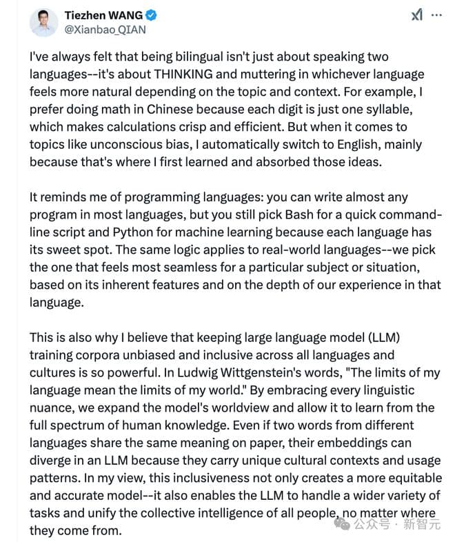 他通过类比人类的思维过程,阐述了双语能力的深层含义:掌握双语绝非仅仅局限于能够流利使用两种语言,更是一种独特的思维模式。在这种模式下,大脑会依据当下的场景,本能地挑选最为适配的语言。例如,在进行数学运算时,使用中文往往简洁高效,因为每个数字仅需一个音节;而在探讨「无意识偏见」这类概念时,大脑则会自然地切换到英文,这是由于最初接触该概念便是通过英文。