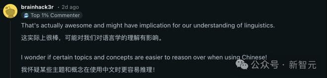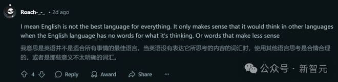 当然,也有另外的推测观点。比如网友Someone Kong分析认为,这可能是因为中文更短,所以会在强化学习中获得更多的奖励。